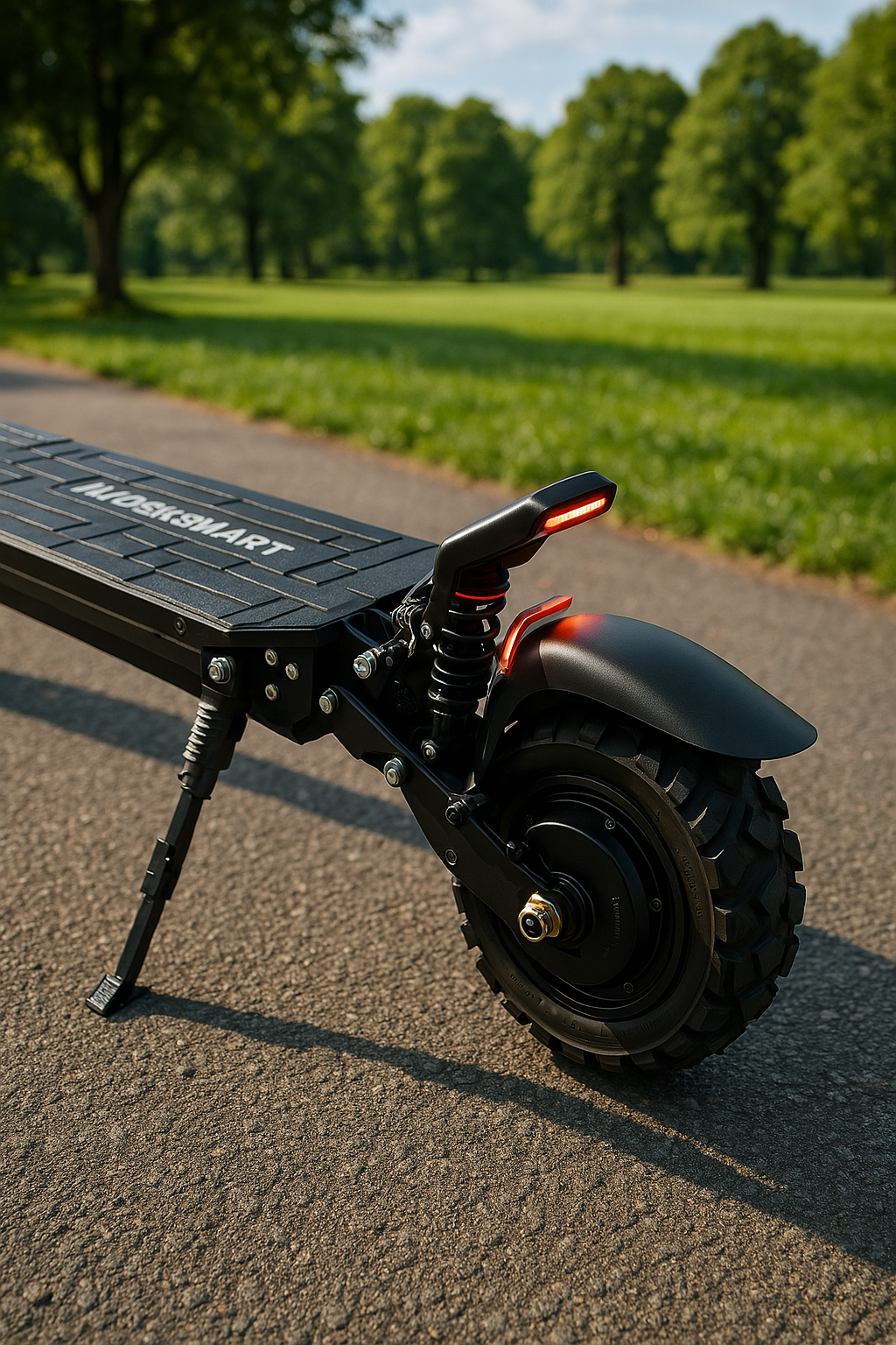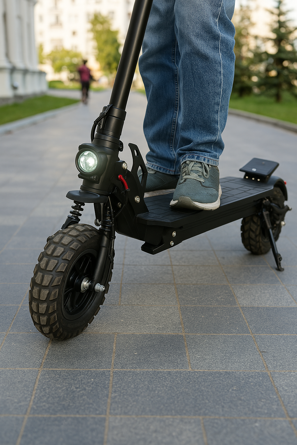 Да, самокат справляется с легким бездорожьем. Широкие колеса и амортизация спереди и сзади позволяют уверенно чувствовать себя на гравийных и проселочных дорогах. Главное — не злоупотреблять скоростью на сильно разбитых участках.